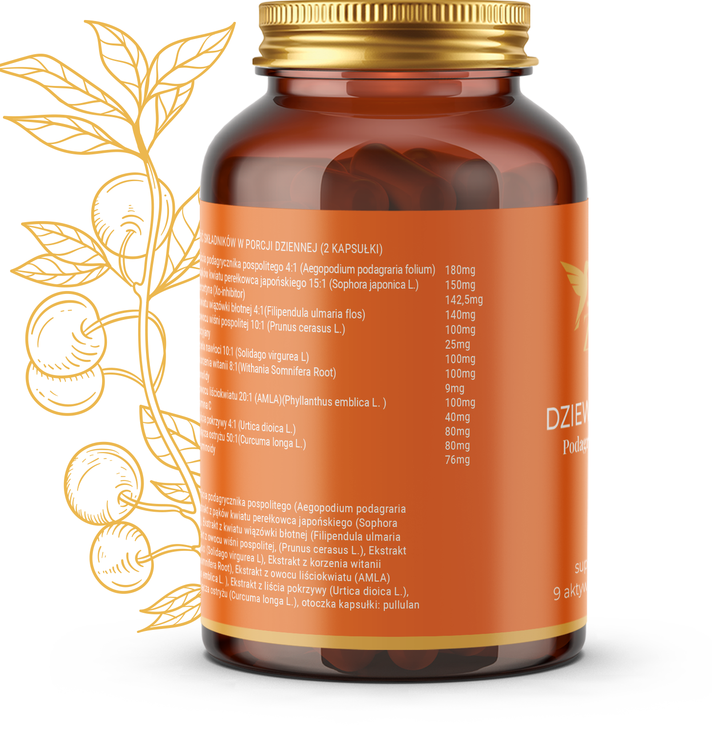 - codzienny komfort stawów i lekkość ruchu (podagrycznik, wiązówka, kurkuma),